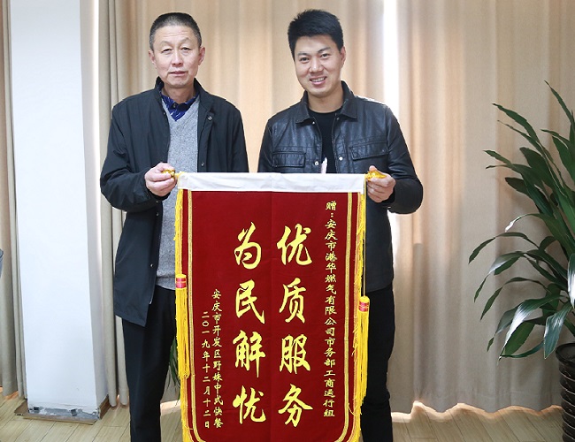 12月16日上午,市開發(fā)區(qū)野妹中式快餐負(fù)責(zé)人來到安慶港華,將一面繡有“優(yōu)質(zhì)服務(wù) 為民解憂”的錦旗,贈(zèng)與公司工商運(yùn)行組表示感謝。