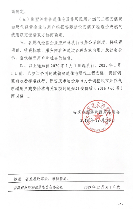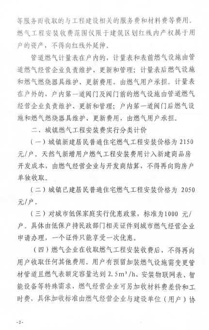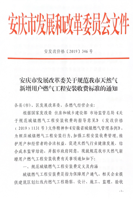 安慶市發(fā)展改革委關(guān)于規(guī)范我市天然氣新增用戶燃?xì)夤こ贪惭b收費(fèi)標(biāo)準(zhǔn)的通知(2019) 發(fā)布時(shí)間:2020-02-19    閱讀次數(shù):12589次