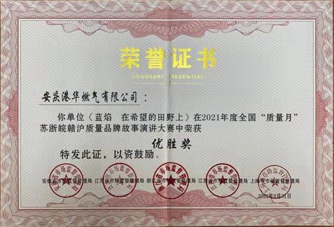 日前,安慶港華燃?xì)膺x送演講視頻作品《藍(lán)焰 在希望的田野上》榮獲2021年全國(guó)“質(zhì)量月”蘇浙皖贛滬質(zhì)量品牌故事演講大賽優(yōu)勝獎(jiǎng)。