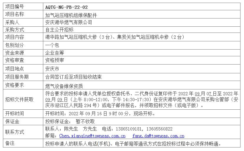 安慶港華天然氣用加氣站壓縮機(jī)組維保配件采購招標(biāo)公告