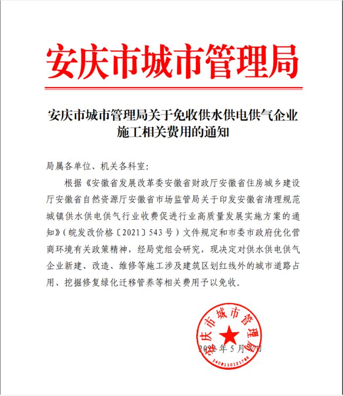 安慶市城市管理局關(guān)于免收供水供電供氣企業(yè)施工相關(guān)費(fèi)用的通知