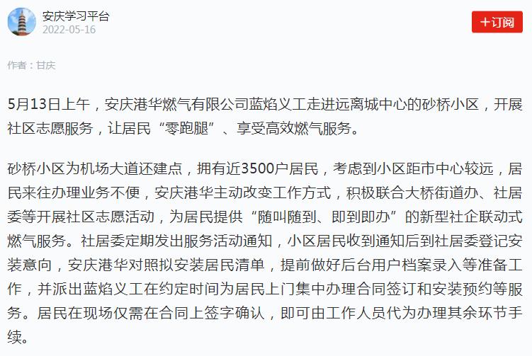 安慶:服務(wù)隨叫隨到 業(yè)務(wù)即到即辦 打造燃?xì)馍鐓^(qū)服務(wù)新模式(轉(zhuǎn)載于學(xué)習(xí)強國)