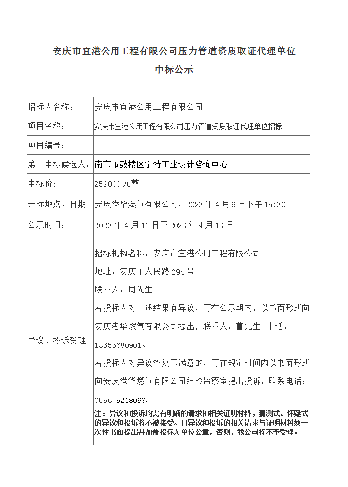 安慶市宜港公用工程有限公司壓力管道資質(zhì)取證代理單位中標(biāo)公示