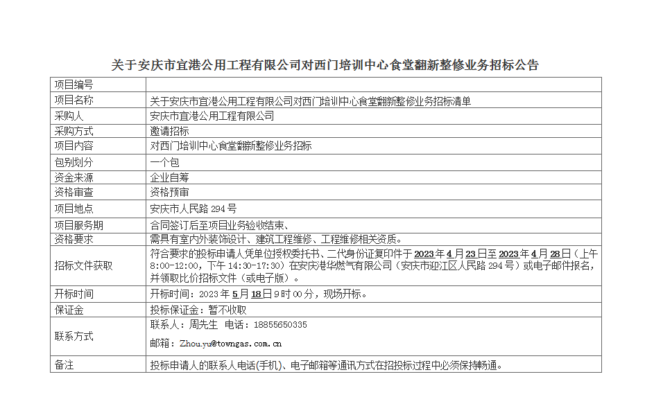 關(guān)于安慶市宜港公用工程有限公司對(duì)西門培訓(xùn)中心食堂翻新整修業(yè)務(wù)招標(biāo)公告