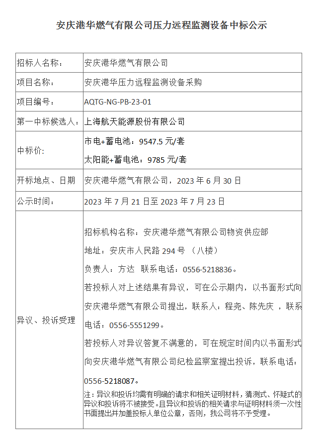 安慶港華燃?xì)庥邢薰緣毫h(yuǎn)程監(jiān)測(cè)設(shè)備中標(biāo)公示