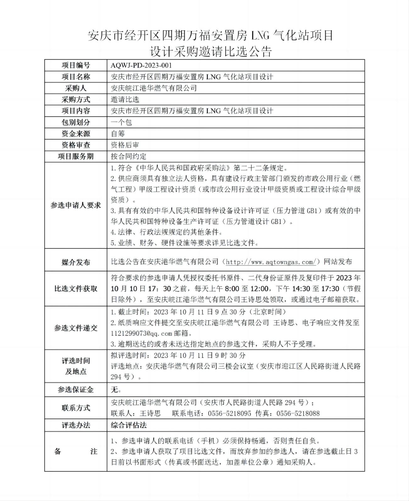 安慶市經(jīng)開區(qū)四期萬福安置房LNG氣化站項目 設(shè)計采購邀請比選公告