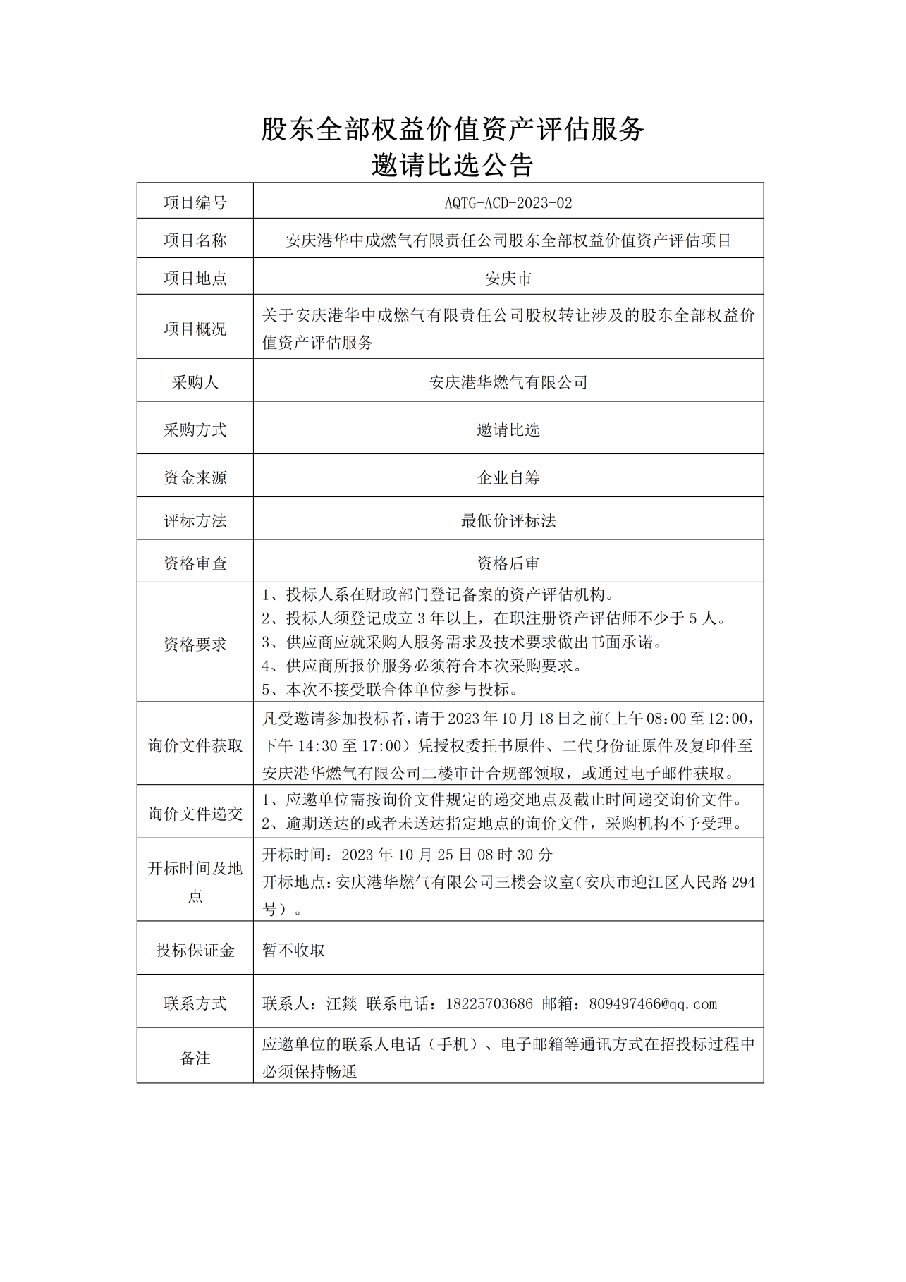 安慶港華中成燃?xì)庥邢薰竟蓶|全部權(quán)益資產(chǎn)評(píng)估服務(wù)邀請(qǐng)比選公告