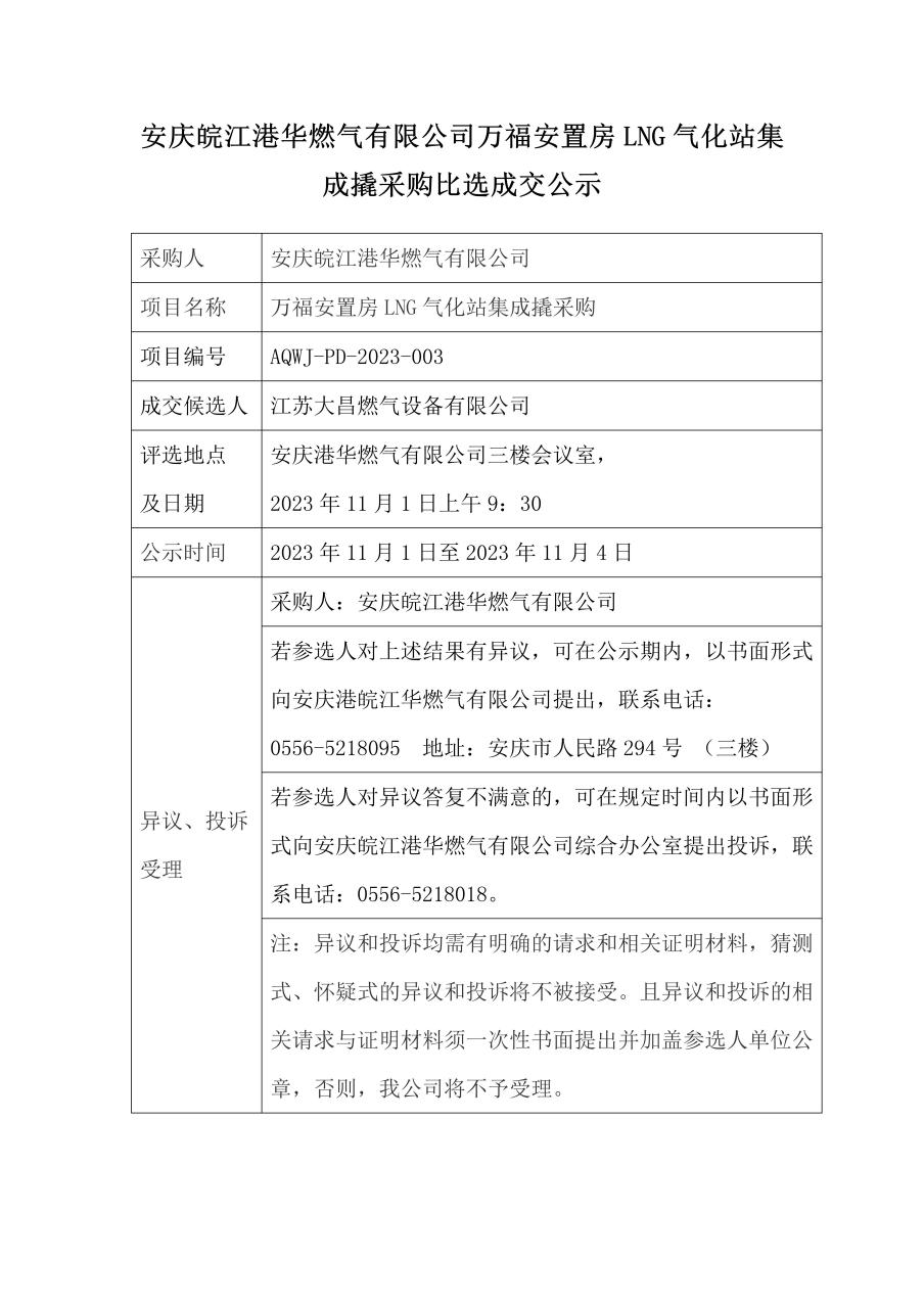 安慶皖江港華燃?xì)庥邢薰救f福安置房LNG氣化站集成撬采購比選成交公示