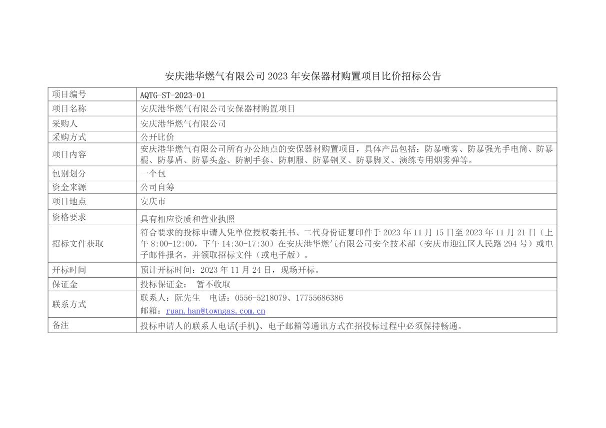 2023安慶港華安保器材購置項目比價招標(biāo)公告