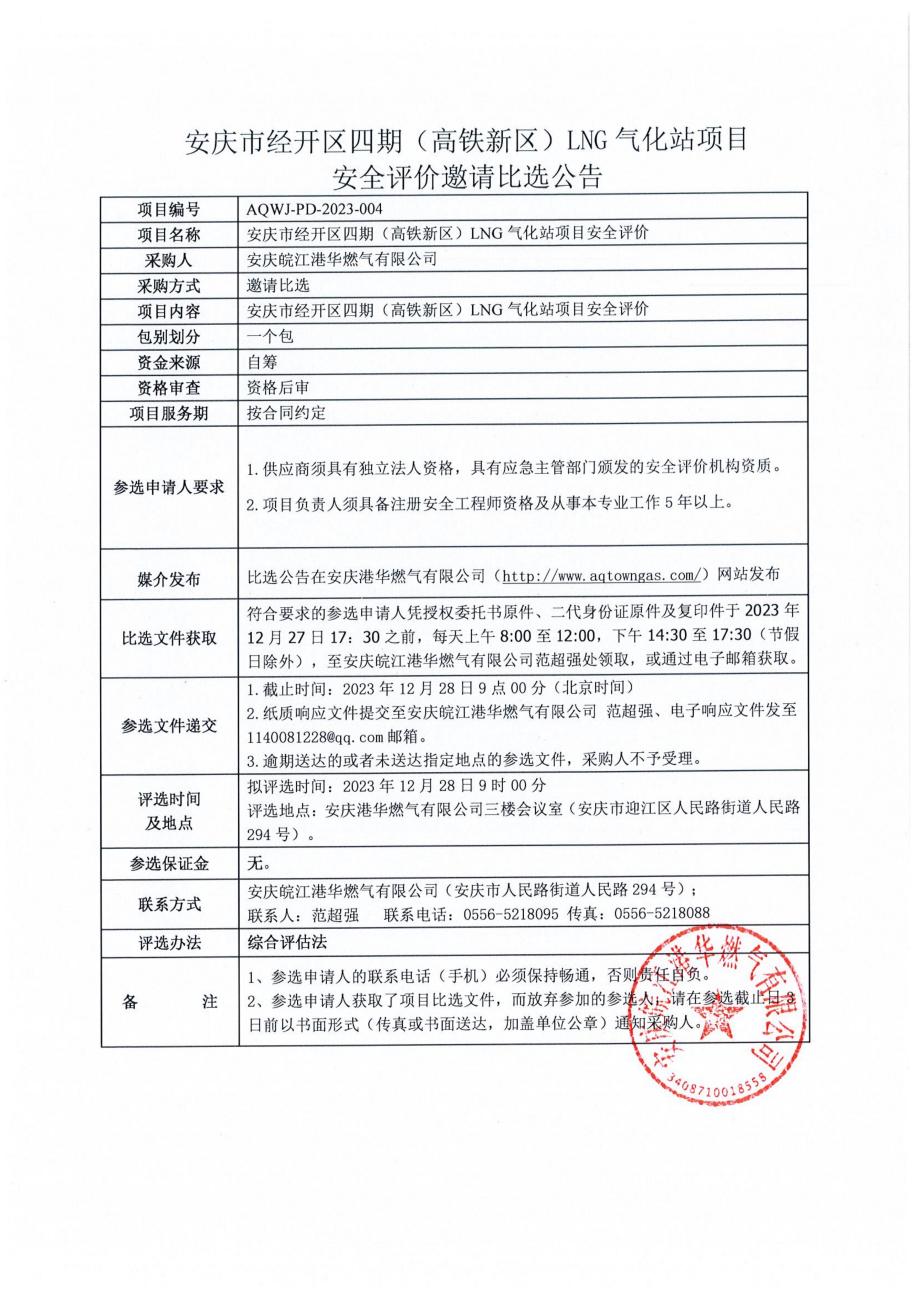 安慶經(jīng)開區(qū)四期(高鐵新區(qū))LNG氣化站安全評(píng)價(jià)邀請(qǐng)比選文件