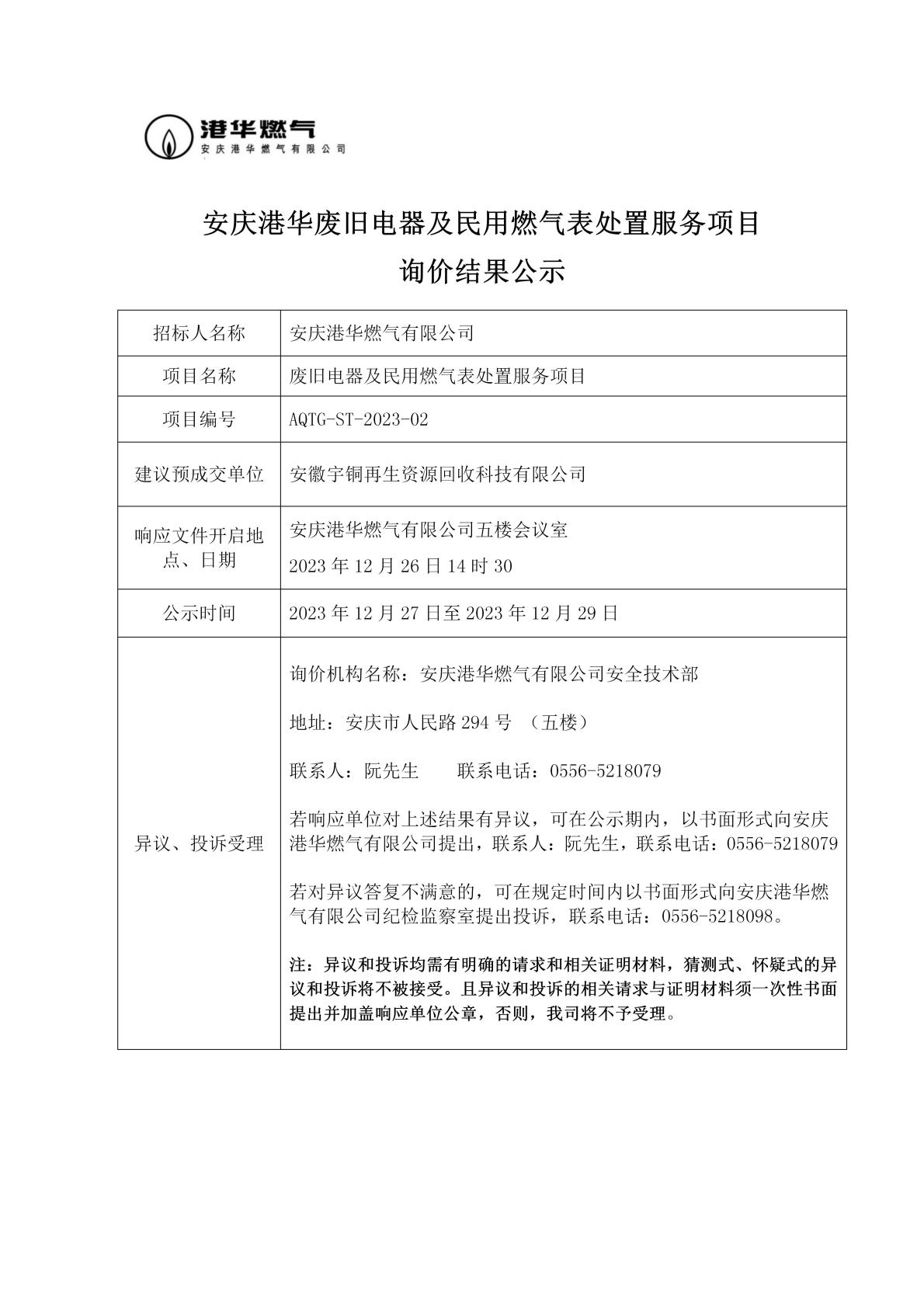 安慶港華廢舊電器及民用燃?xì)獗硖幹梅?wù)項(xiàng)目詢價結(jié)果公示