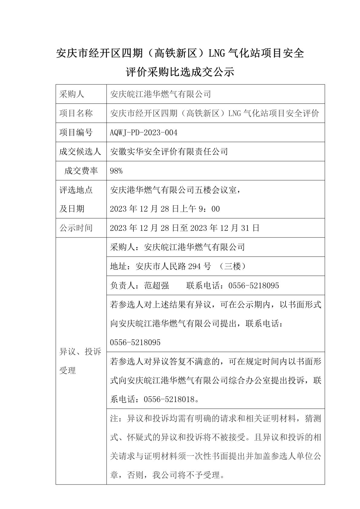 安慶市經(jīng)開區(qū)四期(高鐵新區(qū))LNG氣化站項目安全評價采購比選成交公示