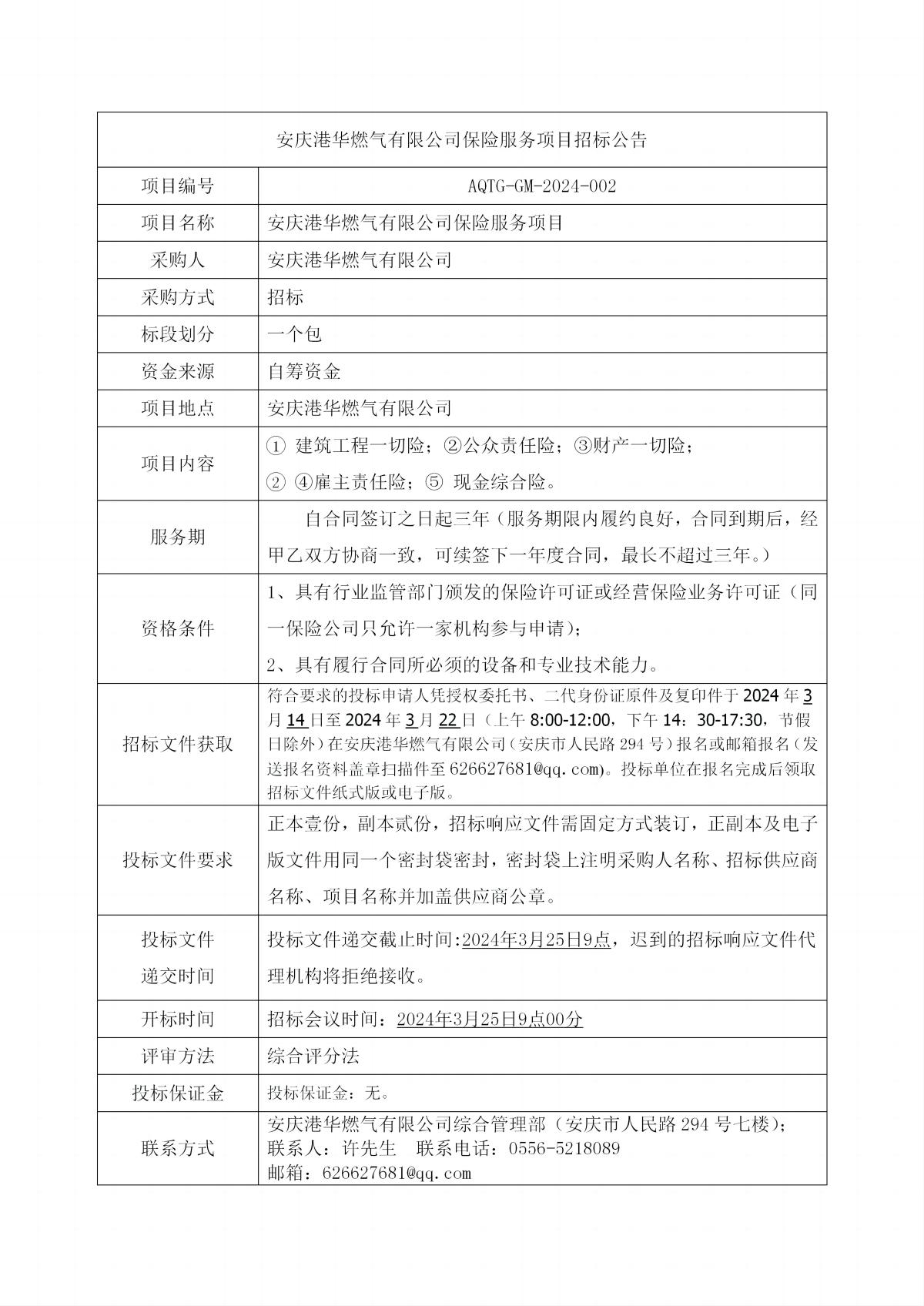 安慶港華燃氣有限公司車輛保險服務項目招標公告