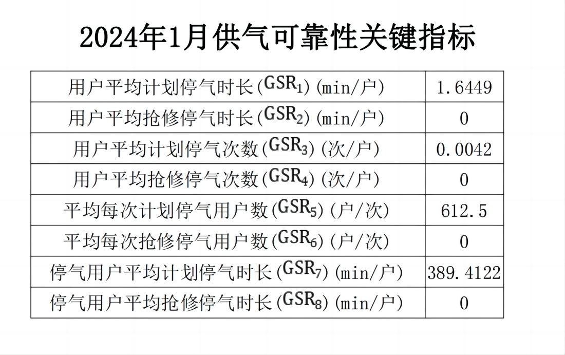 2024年1月供氣可靠性關鍵指標