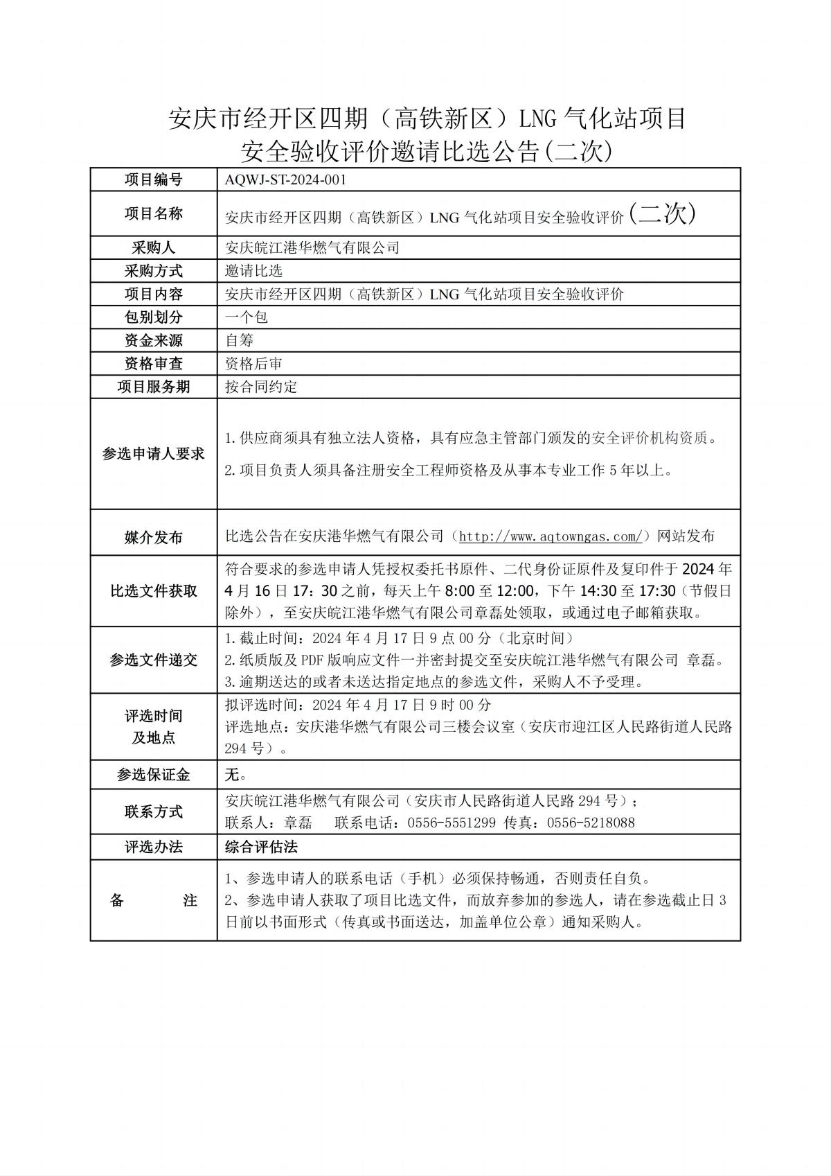 安慶市經(jīng)開區(qū)四期(高鐵新區(qū))LNG 氣化站項目 安全驗收評價邀請比選公告(二次)
