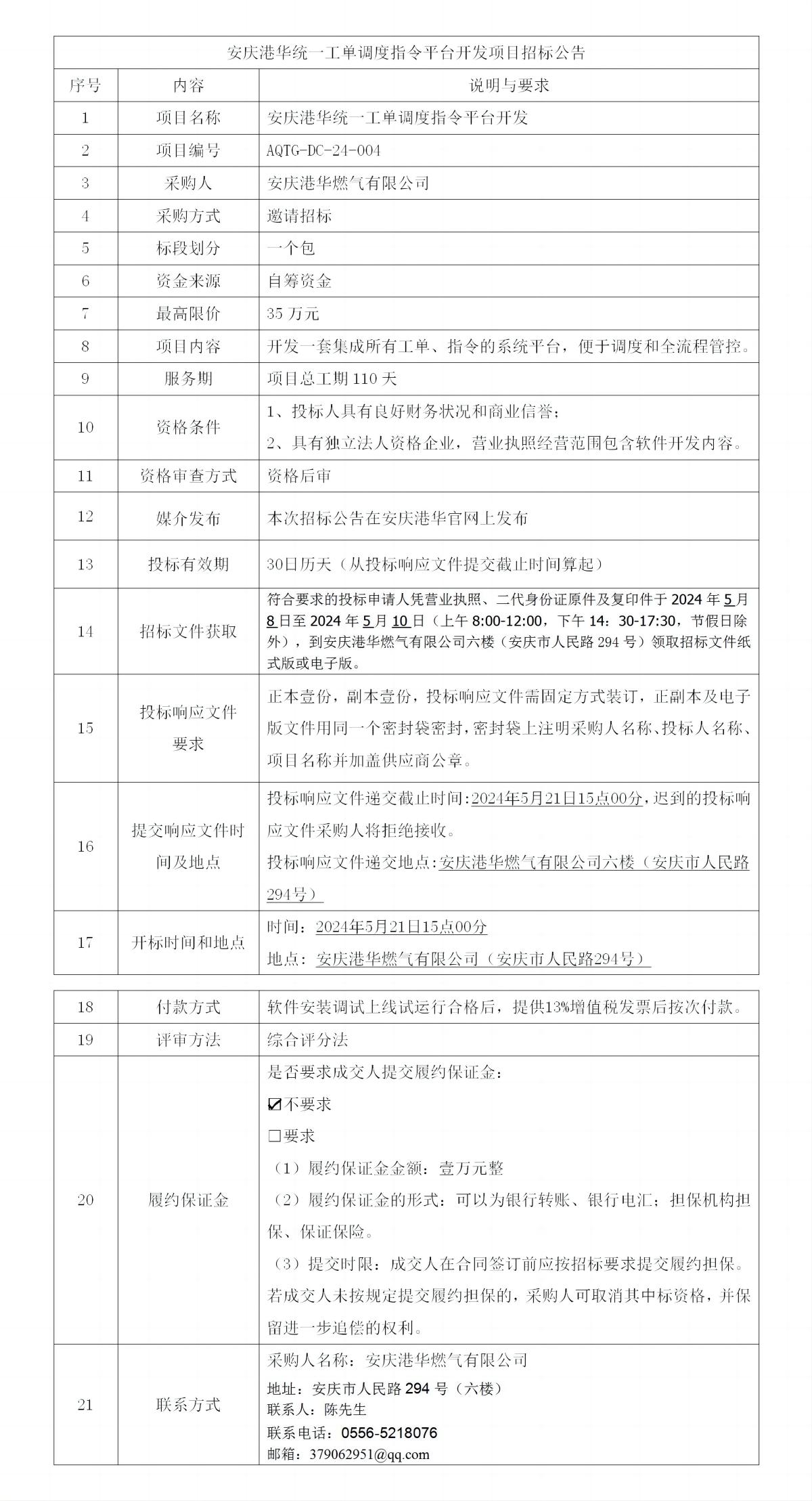 安慶港華統(tǒng)一工單調(diào)度指令平臺開發(fā)項目招標公告
