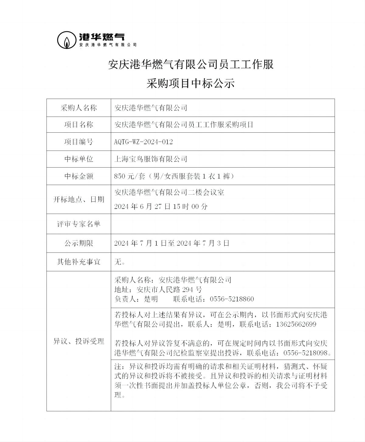安慶港華燃氣有限公司員工工作服采購項目中標公示