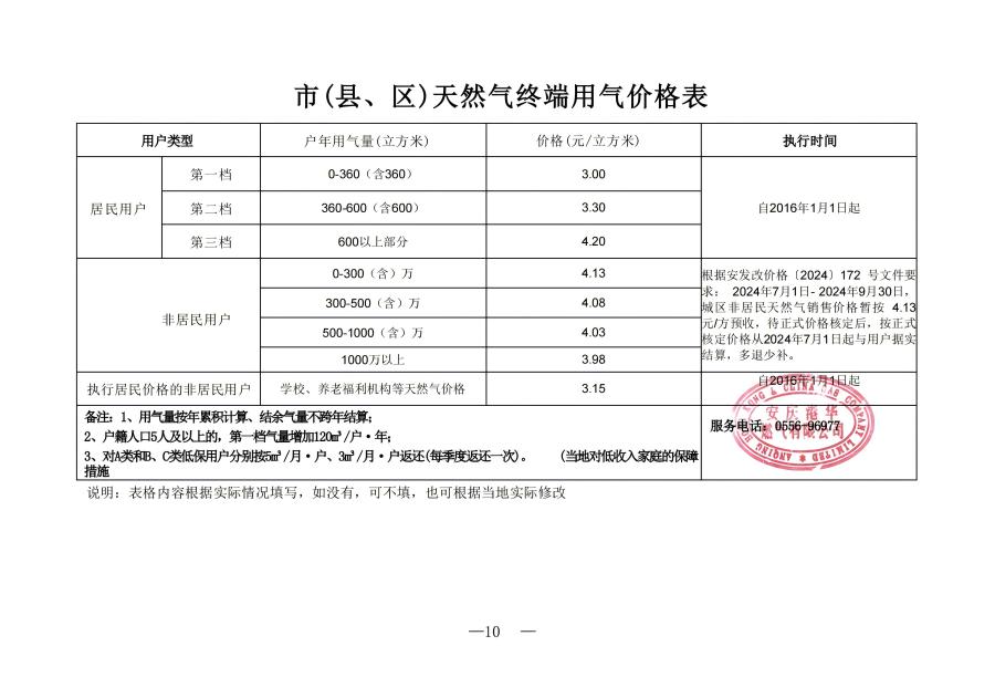 市(縣、區(qū))天然氣終端用氣價(jià)格表(2024)
