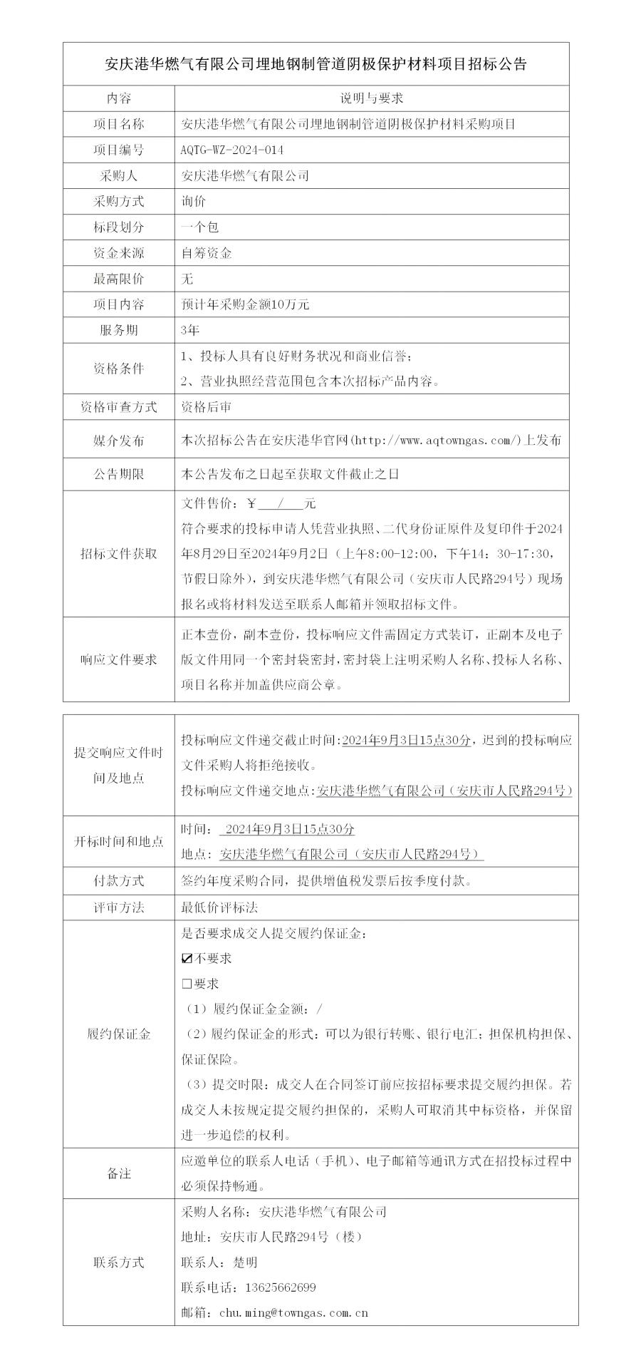 安慶港華燃?xì)庥邢薰韭竦劁撝乒艿狸帢O保護材料項目招標(biāo)公告