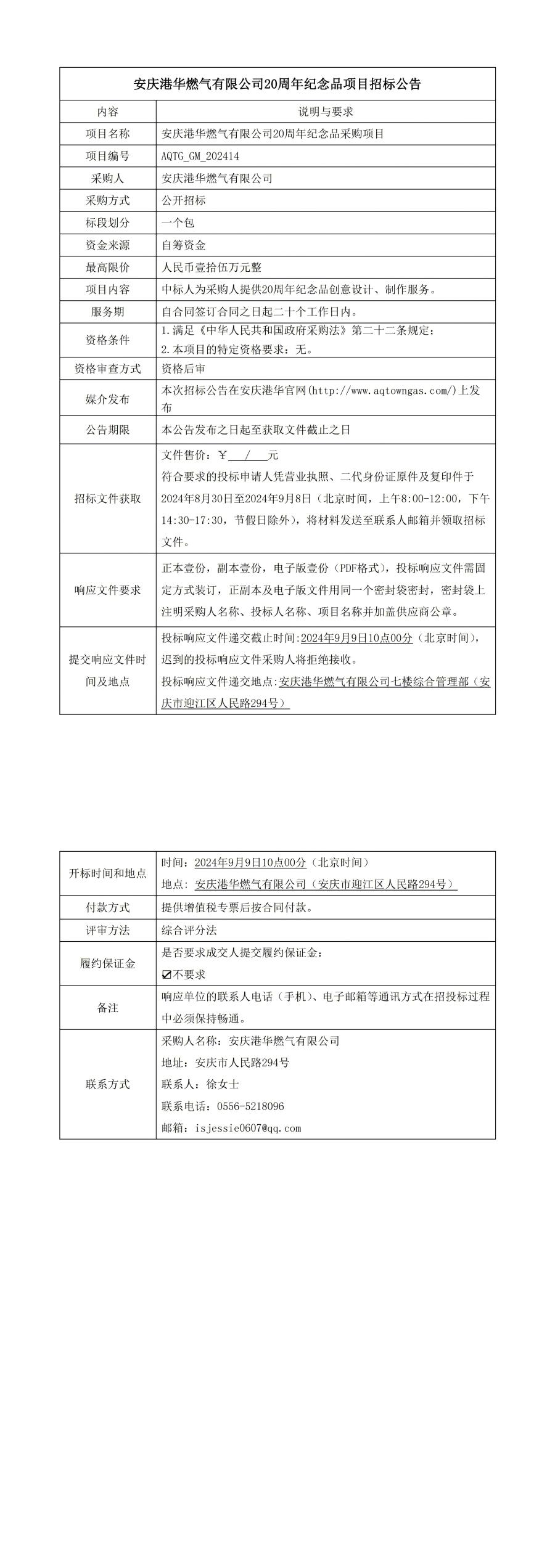 安慶港華燃?xì)庥邢薰?0周年紀(jì)念品項目招標(biāo)公告