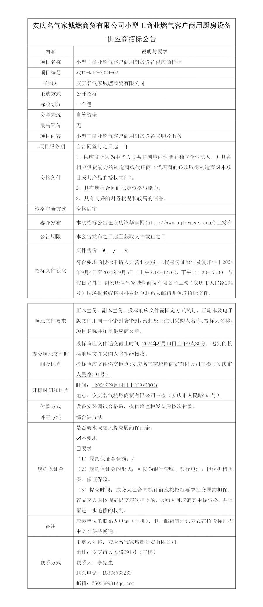 安慶名氣家城燃商貿(mào)有限公司小型工商業(yè)燃?xì)饪蛻羯逃脧N房設(shè)備供應(yīng)商招標(biāo)公告