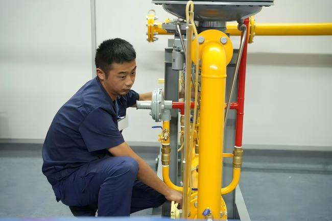 本次競賽分為理論考試和實操競賽兩大部分,內(nèi)容涵蓋技術(shù)方案編制、蒙眼拆裝、工藝系統(tǒng)檢查及故障排除等多項考核內(nèi)容。理論考試主要檢驗參賽選手對燃?xì)夤艿勒{(diào)壓相關(guān)知識的掌握情況,而實操競賽則通過模擬真實工作環(huán)境,全面考察選手的實際操作能力和應(yīng)對突發(fā)情況的能力。在實操競賽中,選手們需要在規(guī)定時間內(nèi)完成蒙眼拆裝切斷閥、排查調(diào)壓器故障并恢復(fù)管道壓力等任務(wù),整個過程需準(zhǔn)確無誤的完成144個零件的拆裝,并一次性調(diào)試合格。比賽現(xiàn)場氣氛緊張而熱烈,選手們?nèi)褙炞ⅰ幏謯Z秒,展現(xiàn)了燃?xì)庑袠I(yè)職工良好的職業(yè)素養(yǎng)和團(tuán)隊協(xié)作精神。