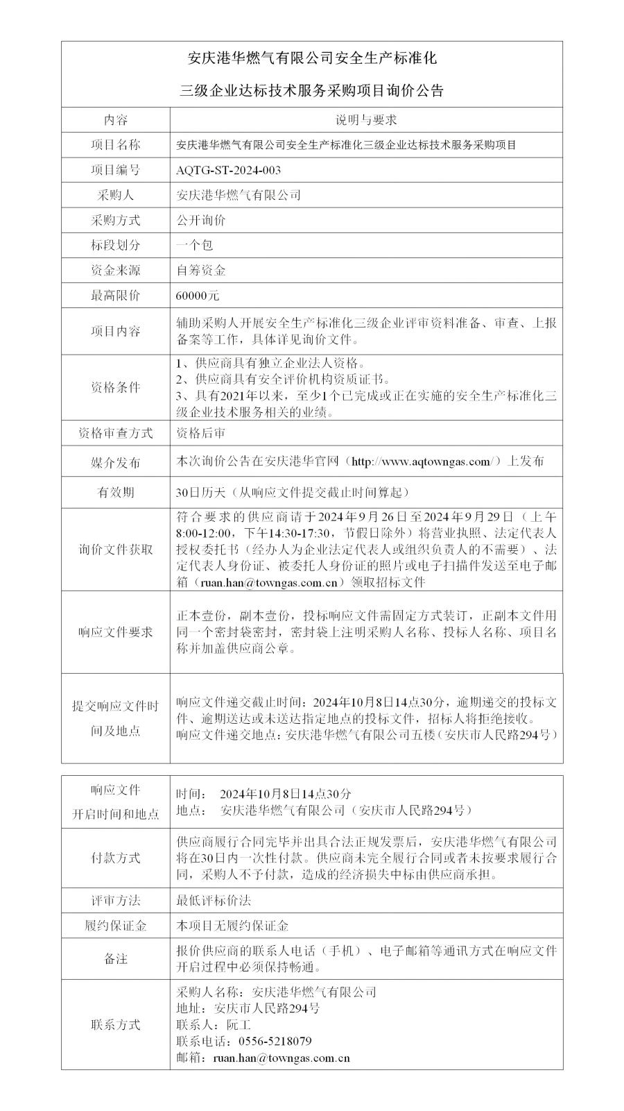 安慶港華燃?xì)庥邢薰景踩a(chǎn)標(biāo)準(zhǔn)化三級企業(yè)達(dá)標(biāo)技術(shù)服務(wù)采購項目詢價公告