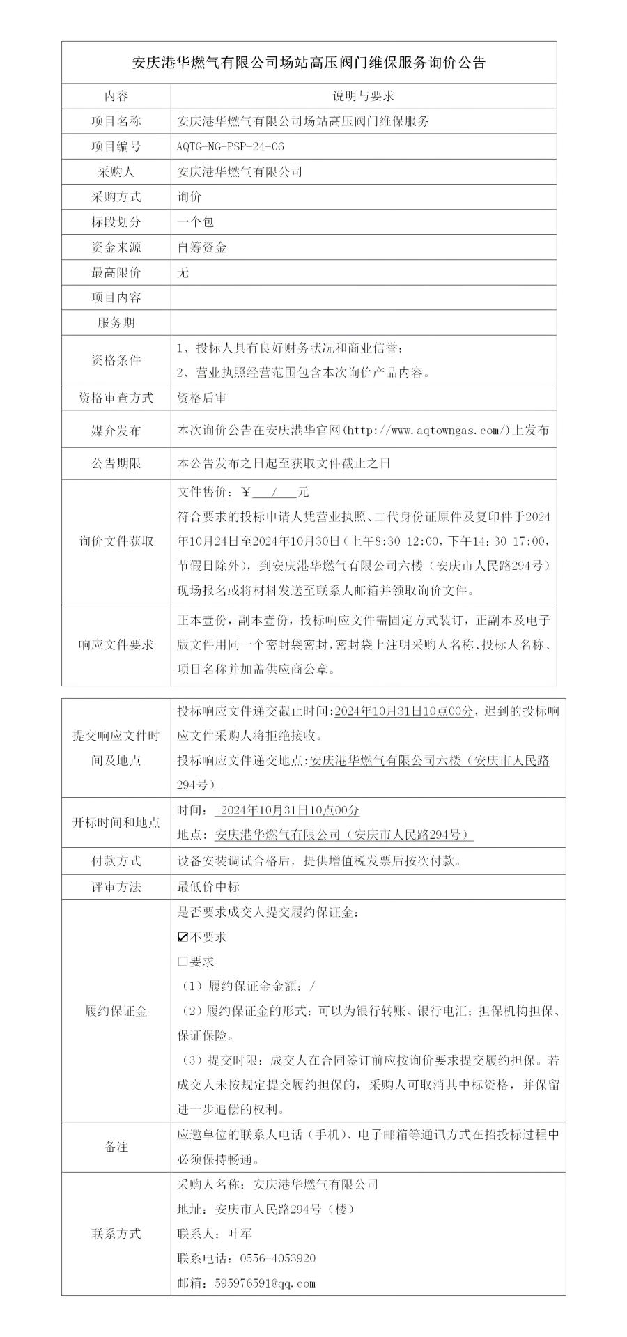 安慶港華燃氣有限公司場站高壓閥門維保服務詢價公告