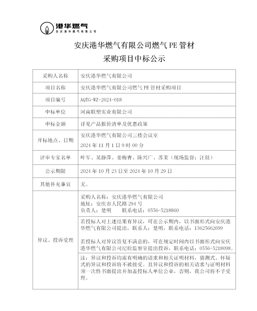 安慶港華燃?xì)庥邢薰救細(xì)釶E管材采購項目中標(biāo)公示