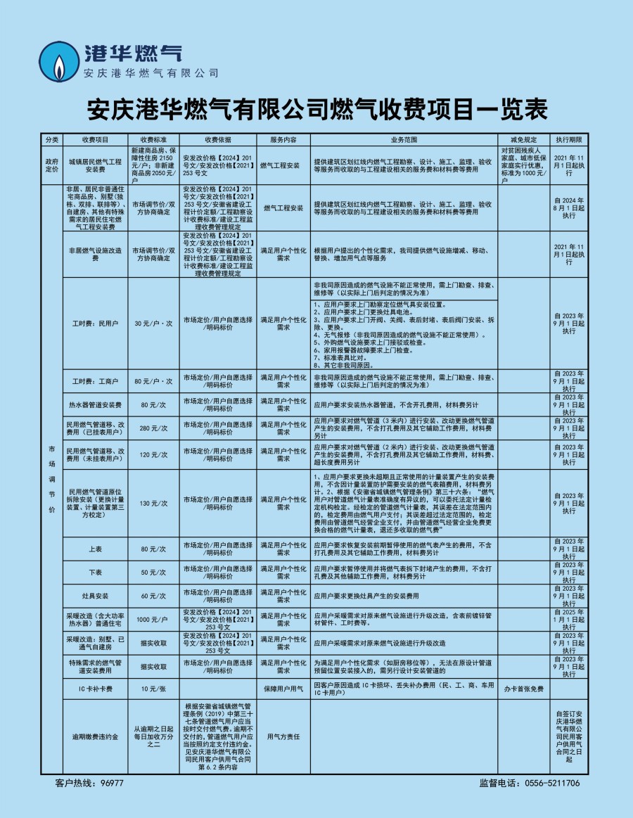 安慶港華燃?xì)庥邢薰臼召M(fèi)項(xiàng)目一覽表(2024)