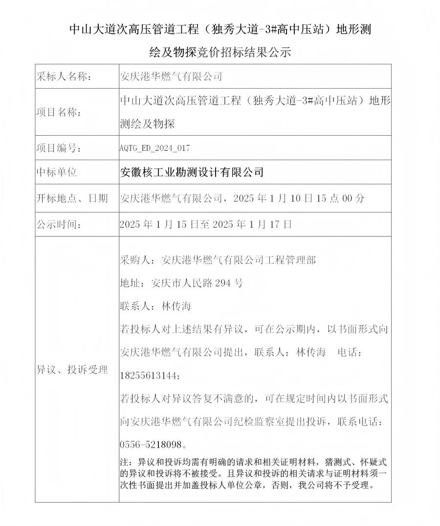 中山大道次高壓管道工程(獨(dú)秀大道-3#高中壓站)地形測(cè)繪及物探競(jìng)價(jià)招標(biāo)結(jié)果公示
