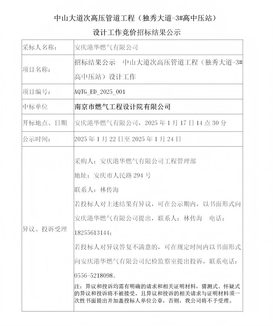 中山大道次高壓管道工程(獨(dú)秀大道-3#高中壓站)設(shè)計(jì)工作競價(jià)招標(biāo)結(jié)果公示
