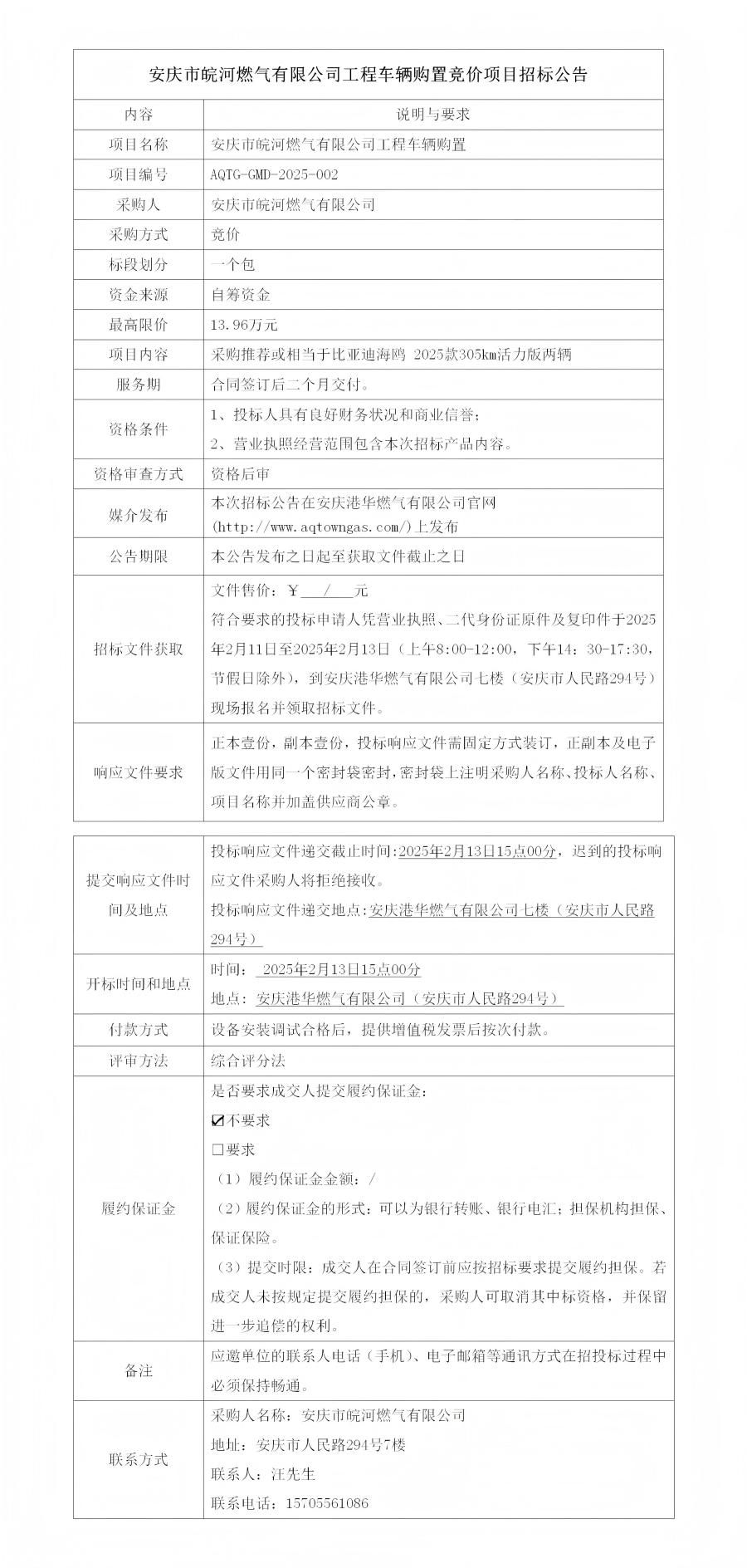 安慶市皖河燃氣有限公司工程車輛購置競價項目招標公告