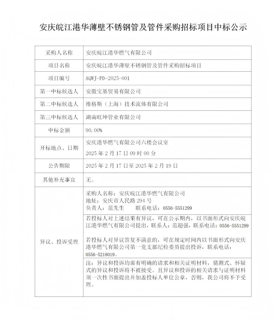 安慶皖江港華薄壁不銹鋼管及管件采購(gòu)招標(biāo)項(xiàng)目中標(biāo)公示