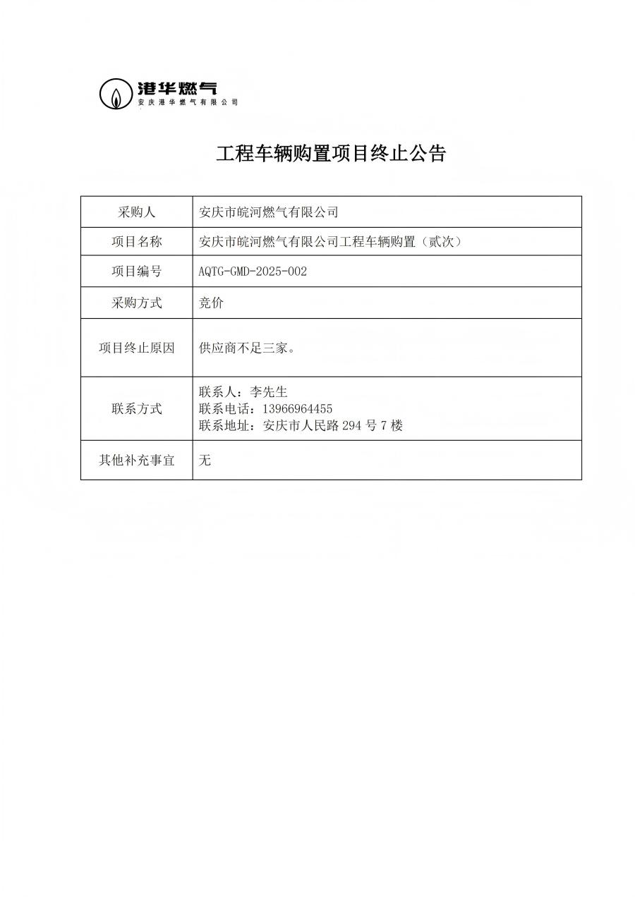 工程車輛購置項目終止公告