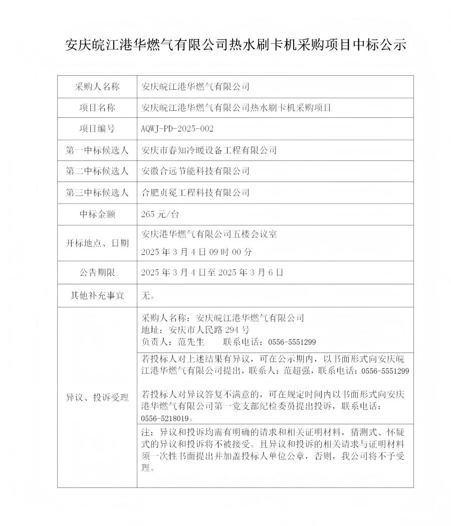 安慶皖江港華燃?xì)庥邢薰緹崴⒖C(jī)采購項(xiàng)目中標(biāo)公示