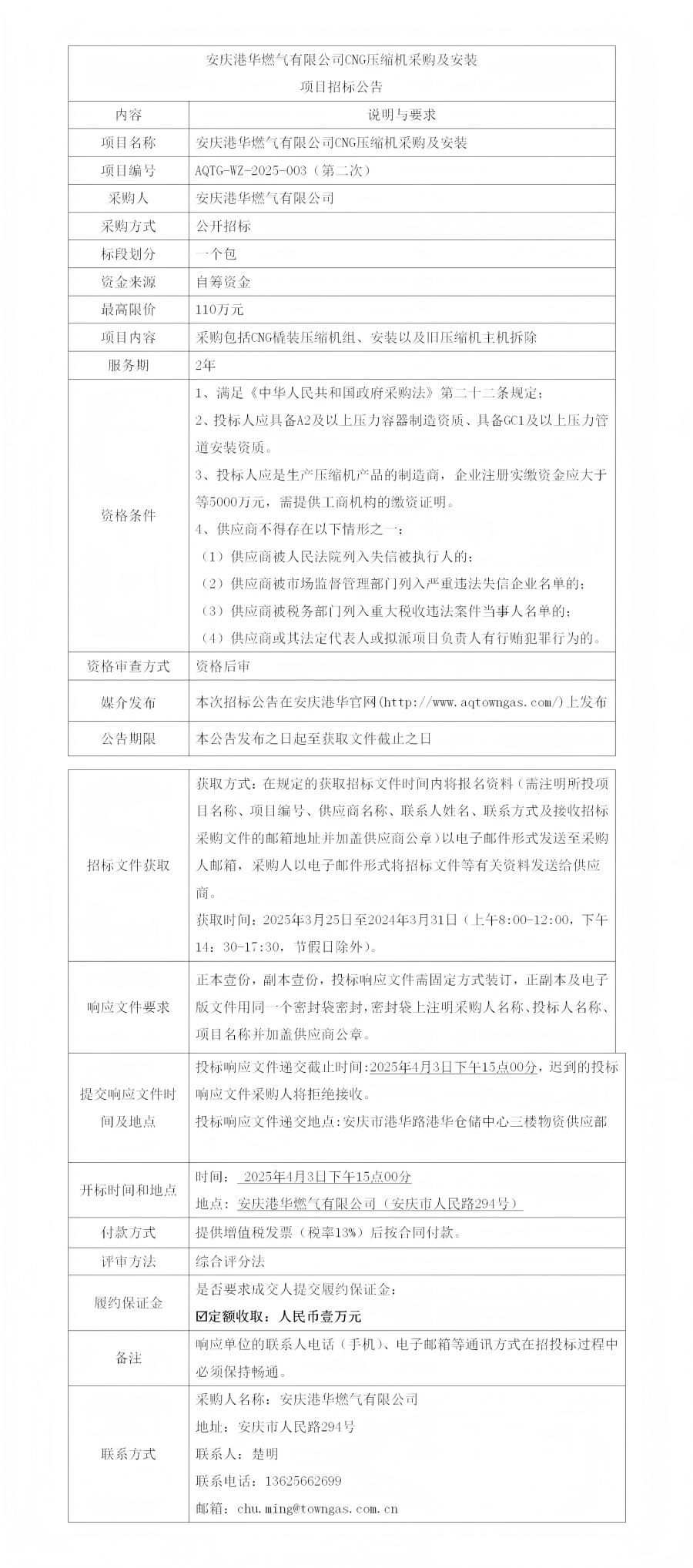 安慶港華燃?xì)庥邢薰綜NG壓縮機(jī)采購及安裝項(xiàng)目招標(biāo)公告