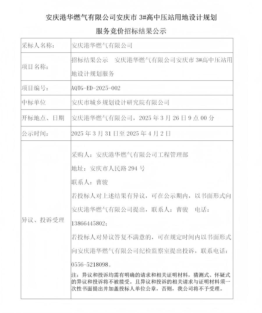 安慶港華燃?xì)庥邢薰景矐c市3#高中壓站用地設(shè)計(jì)規(guī)劃服務(wù)競價(jià)招標(biāo)結(jié)果公示