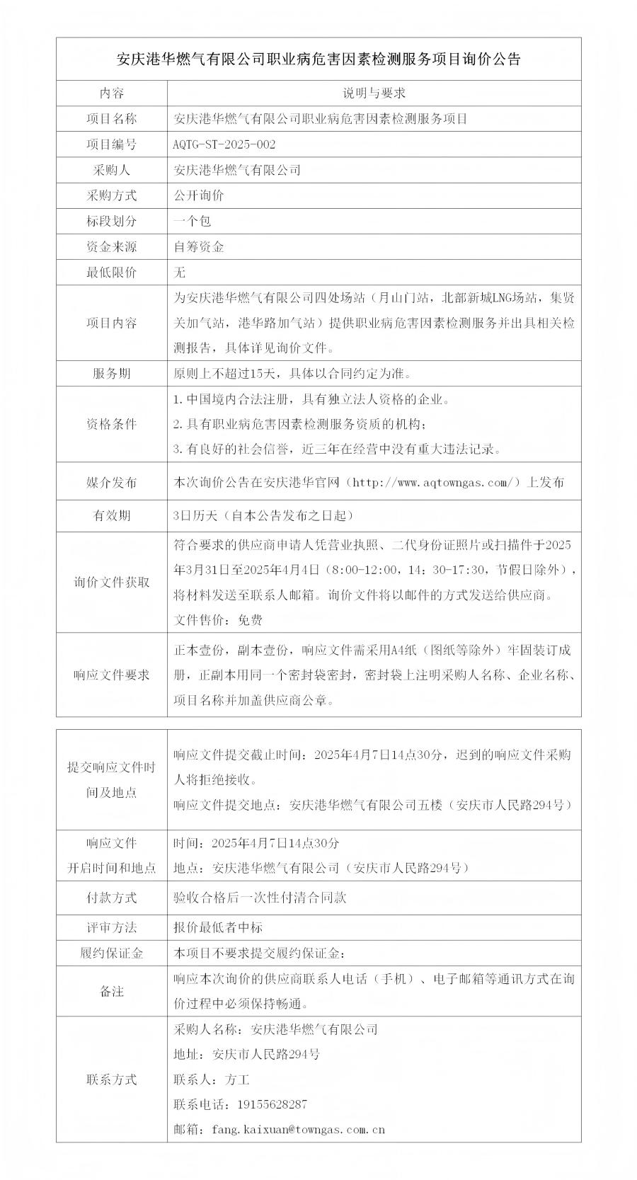 安慶港華燃氣有限公司職業(yè)病危害因素檢測服務(wù)項目詢價公告