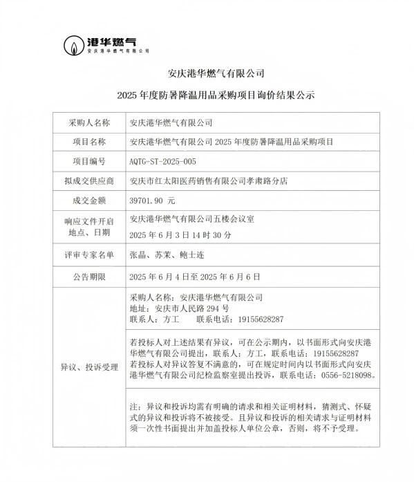 安慶港華燃?xì)庥邢薰?025年度防暑降溫用品采購項(xiàng)目詢價結(jié)果公示