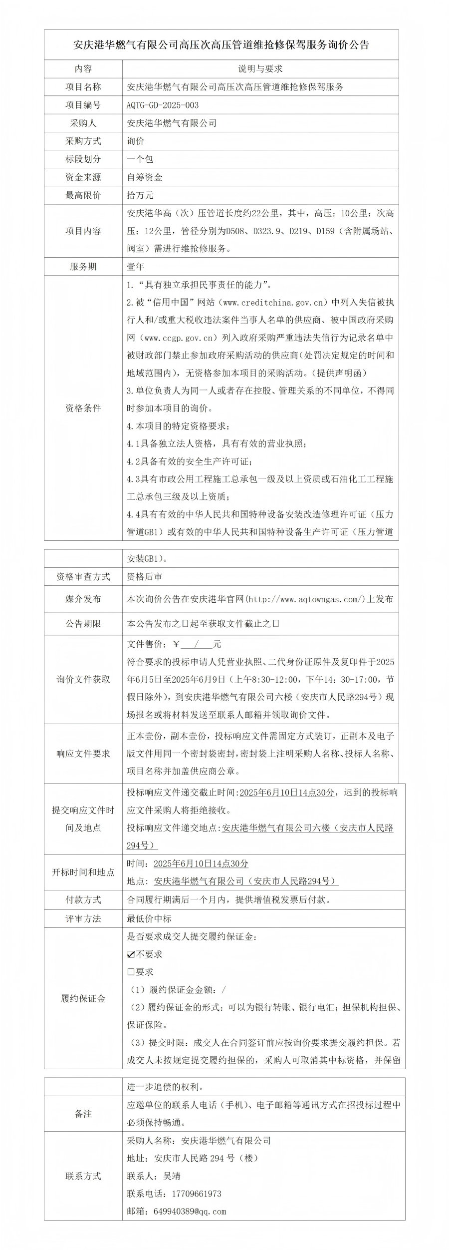 安慶港華燃?xì)庥邢薰靖邏捍胃邏汗艿谰S搶修保駕服務(wù)詢(xún)價(jià)公告