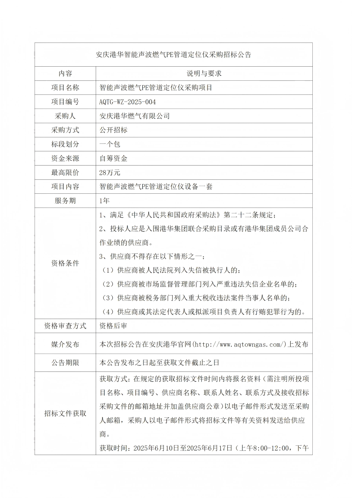 安慶港華智能聲波燃?xì)釶E管道定位儀采購招標(biāo)公告