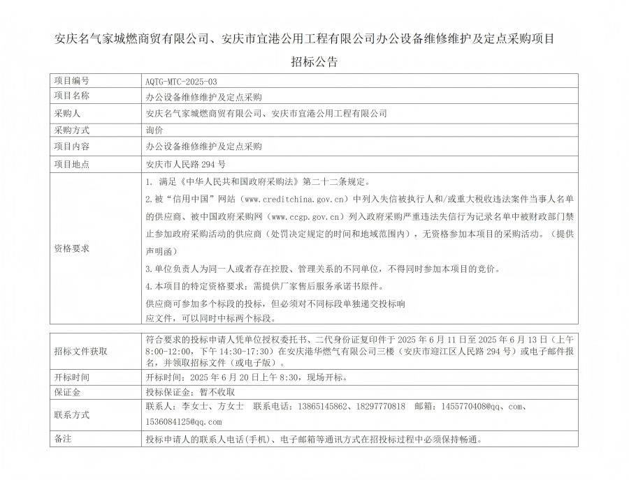 安慶名氣家城燃商貿(mào)有限公司、安慶市宜港公用工程有限公司辦公設(shè)備維修維護(hù)及定點(diǎn)采購招標(biāo)公告