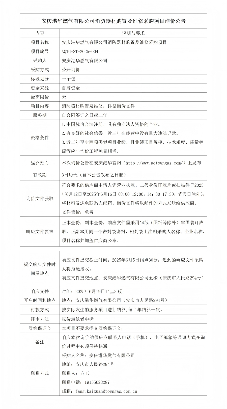 安慶港華燃?xì)庥邢薰鞠榔鞑馁徶眉熬S修采購項目詢價公告