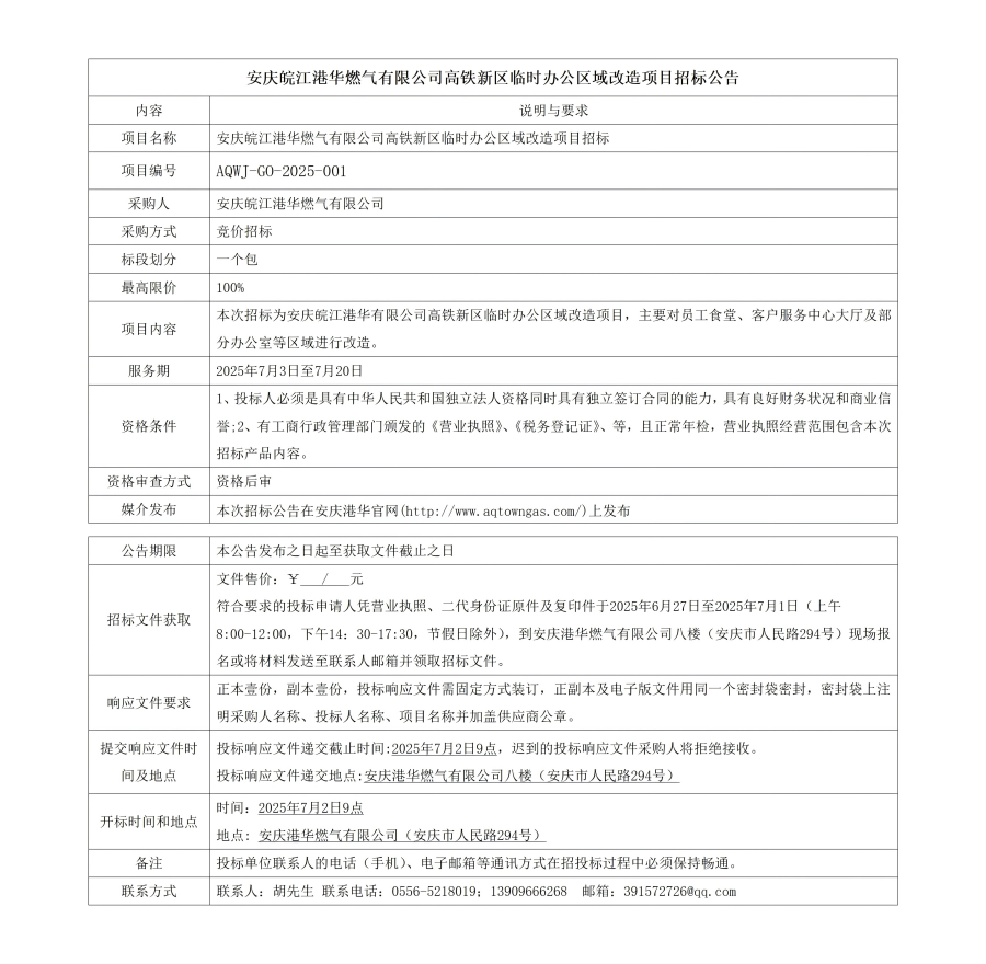 安慶皖江港華燃氣有限公司高鐵新區(qū)臨時辦公區(qū)域改造項目招標(biāo)公告