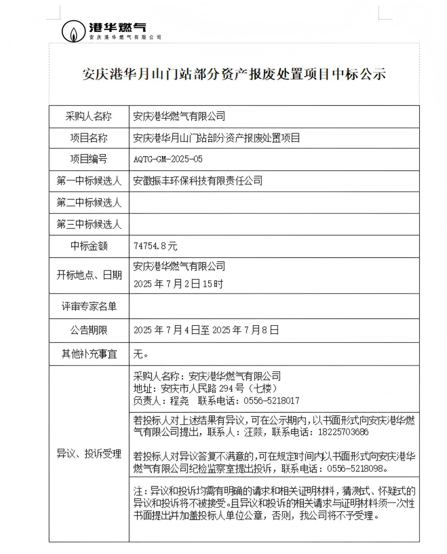安慶港華月山門站部分資產(chǎn)報廢處置項目中標(biāo)公示