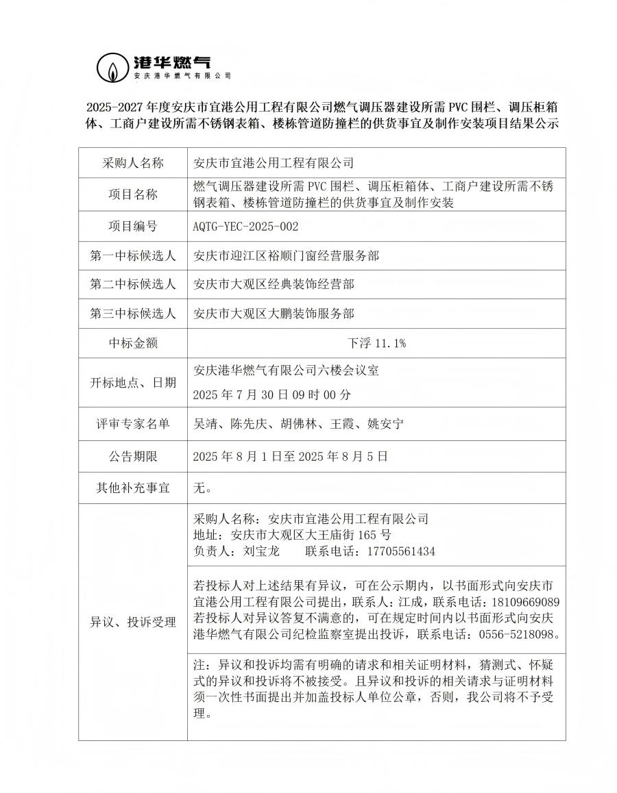 2025-2027年度安慶市宜港公用工程有限公司燃?xì)庹{(diào)壓器建設(shè)所需PVC圍欄、調(diào)壓柜箱體、工商戶建設(shè)所需不銹鋼表箱、樓棟管道防撞欄的供貨事宜及制作安裝項(xiàng)目結(jié)果公示