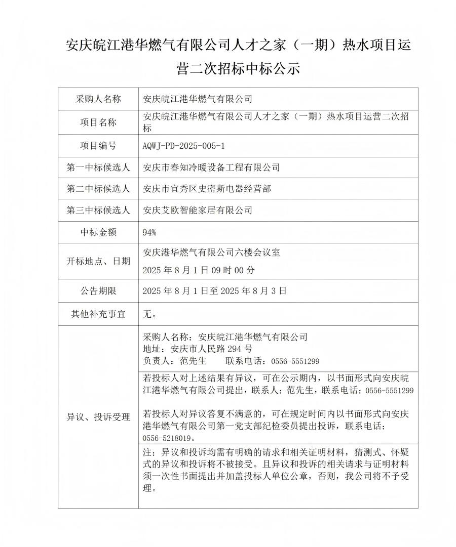 安慶皖江港華燃?xì)庥邢薰救瞬胖遥ㄒ黄冢崴?xiàng)目運(yùn)營(yíng)二次招標(biāo)中標(biāo)公示