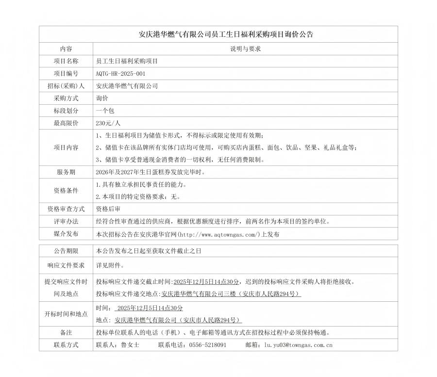 安慶港華燃?xì)庥邢薰締T工生日福利采購項(xiàng)目詢價(jià)公告