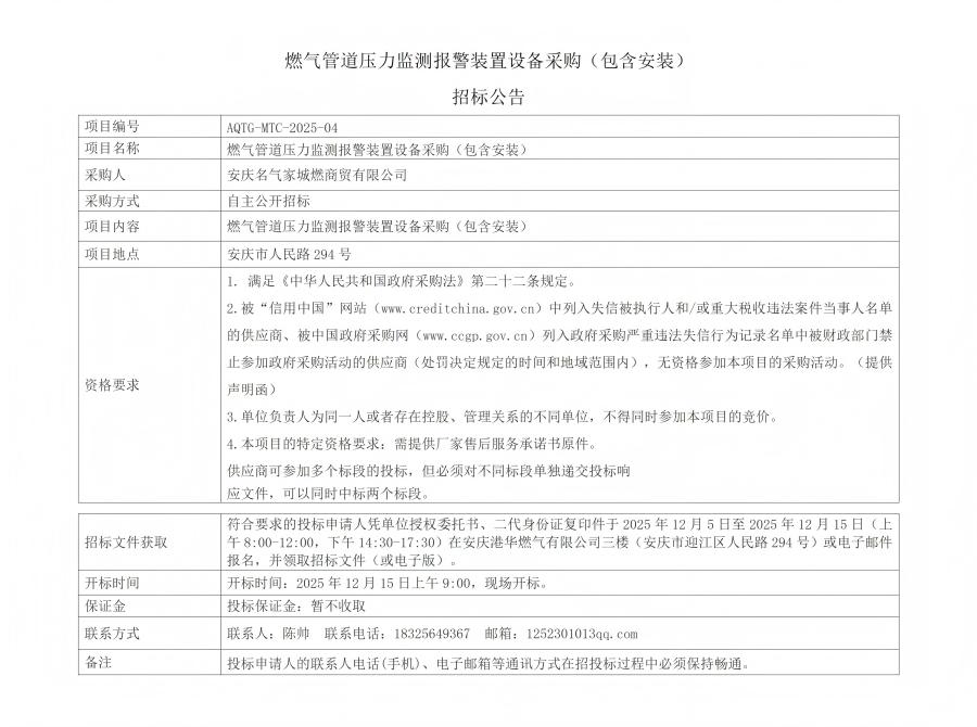 燃氣管道壓力監(jiān)測報警裝置設(shè)備采購(包含安裝)招標(biāo)公告